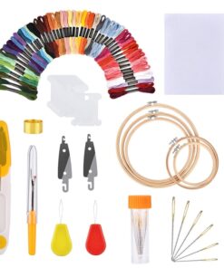 La confezione include: 50 fili da ricamo, 5 telai da ricamo, 2 tessuti per punto croce, 9 aghi, 1 scatola per agh