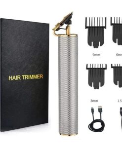 - Modello: T8-B, Colore: Nero, sfumato, Oro, Argento, Potenza: 3 W, Capacità della batteria: 700 mAh, Tempo di ricarica: 2 ore, Orario di lavoro: 120 minuti, Compatibile con la lama sottile Andis, Ingresso carica: 5 V 1 A, Dimensioni: 1,3 pollici (L) * 5,9 pollici (H)